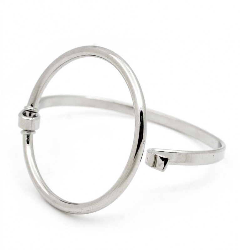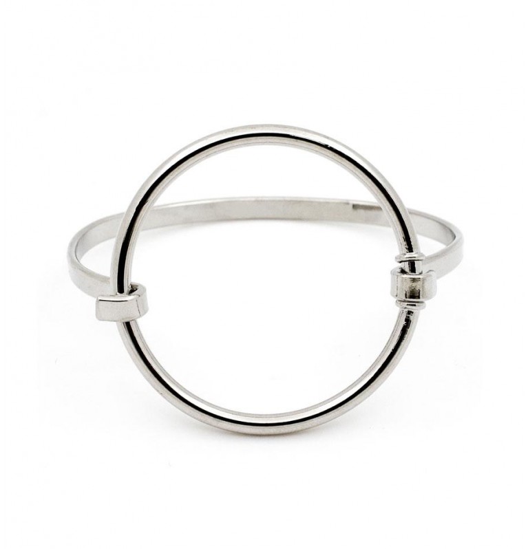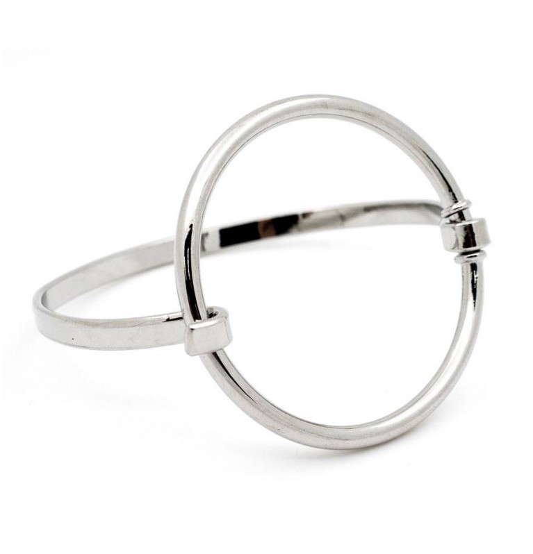 This bangle is just what you need to add glamour to your outfit. It has a silver tone, a circle accent that is cut out in the middle, and an open end. Match it with your favorite top and jeans!